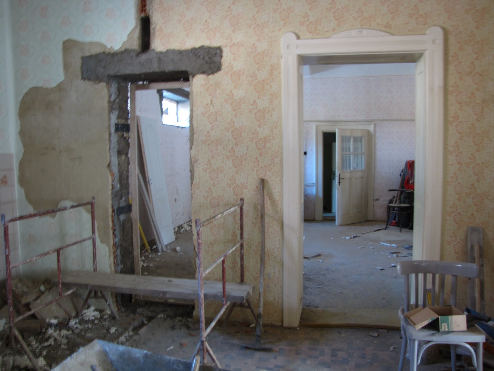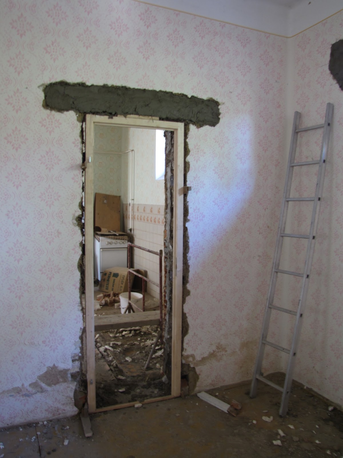 4. Kőművesünk ajtót varázsolt a fürdőnek (jelenleg ez úgy néz ki, hogy a hátsó szobába van egy be- és egy kijáratunk is).