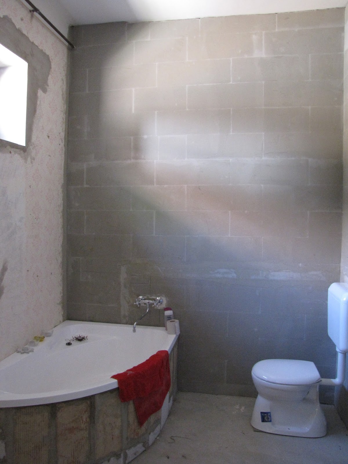 Igen, jól látjátok, nincs burkolat, nincs mosdókagyló, nincs fűtés. Az ok: nincs pénz. Szóval szépen sorjában mindent, lehet gyűjtögetni; legalább lesz időnk gondolkodni (és reménykedni, hogy nyerünk a lottón, és jöhet a cementlap is 🙂