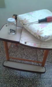 Az ülőfelületet és a háttámlát vettem le, újra kell húzni valami klassz színes műbőrrel. (Na ezt nem én fogom csinálni, sajnos.) A csavarokat (csak stílusosan) egy bébiételes üvegbe gyűjtöttem 😉