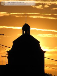 A naplemente előtt a Régi Víztorony kupolája látható, a rozsdás csőhöz csatlakozó épület pedig a régi Villanytelep (később a Téglagyár kiszolgáló épülete), amely a kelet felől városunkba érkezőket fogadja (és szerintem gyönyörű 😉 ).