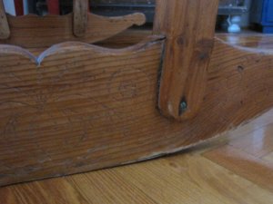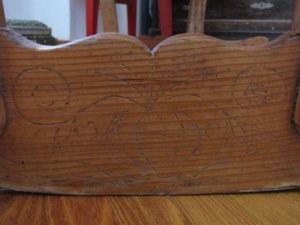 Sajnos részleteket nem tudok, a mintát honnan “vette”, miért nem fejezte be… annyi bizonyos, hogy a bölcső egyik “végét” Ő díszítette ki. Majd, amikor Nővérem készülődött következő “lakónak”, Szüleim folytatták a motívumot a Bölcső másik végén, és oldalain is, karcolásos technikával.