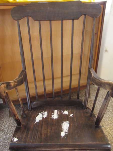 Mintha nem lenne sürgősebb dolgom… (pl. előszobaszekrény, mert a cipőink a pamlag és a fotel alatt tobzódnak a “konyhában” – nemrég tűnt fel, bárhol vagyunk, Picúrhölgy, ha leveszi a cipőjét, rögtön beteszi valami, többnyire szék alá… 🙂 ♥) …szóval nekikezdtem a tök ráérő és így is használható hintaszéknek, mert nehogymár barnán hagyjam!