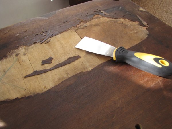 Első gondolatom az volt, hogy mindent leszedek a tetejéről spaklival. De egyrészt nem jártam sikerrel, másrészt a festése előtt egyenletes réteget kellene elérnem itt is…s bár vonzó az eredeti fa, a terveimhez nem megfelelő.