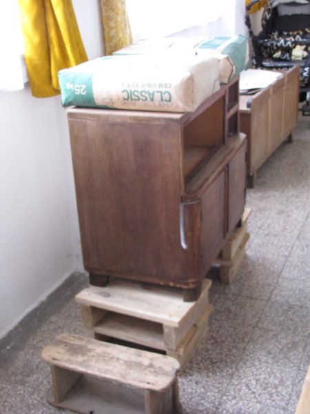 A további munkálatok könnyítése érdekében Párom megemelte a bútort pici raklapokkal. Itt látszik, alul is lesz mit tapaszozni.