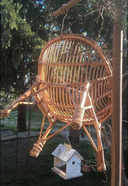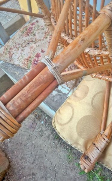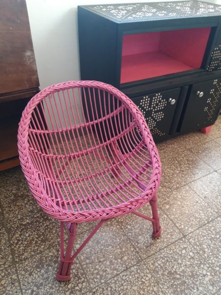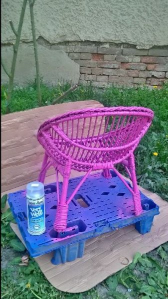 A fújós festék használata szerintem egyértelmű egy fonott kis széknél. (Ja, fotel! Bocsi, Hédi mindig kijavít 🙂 )